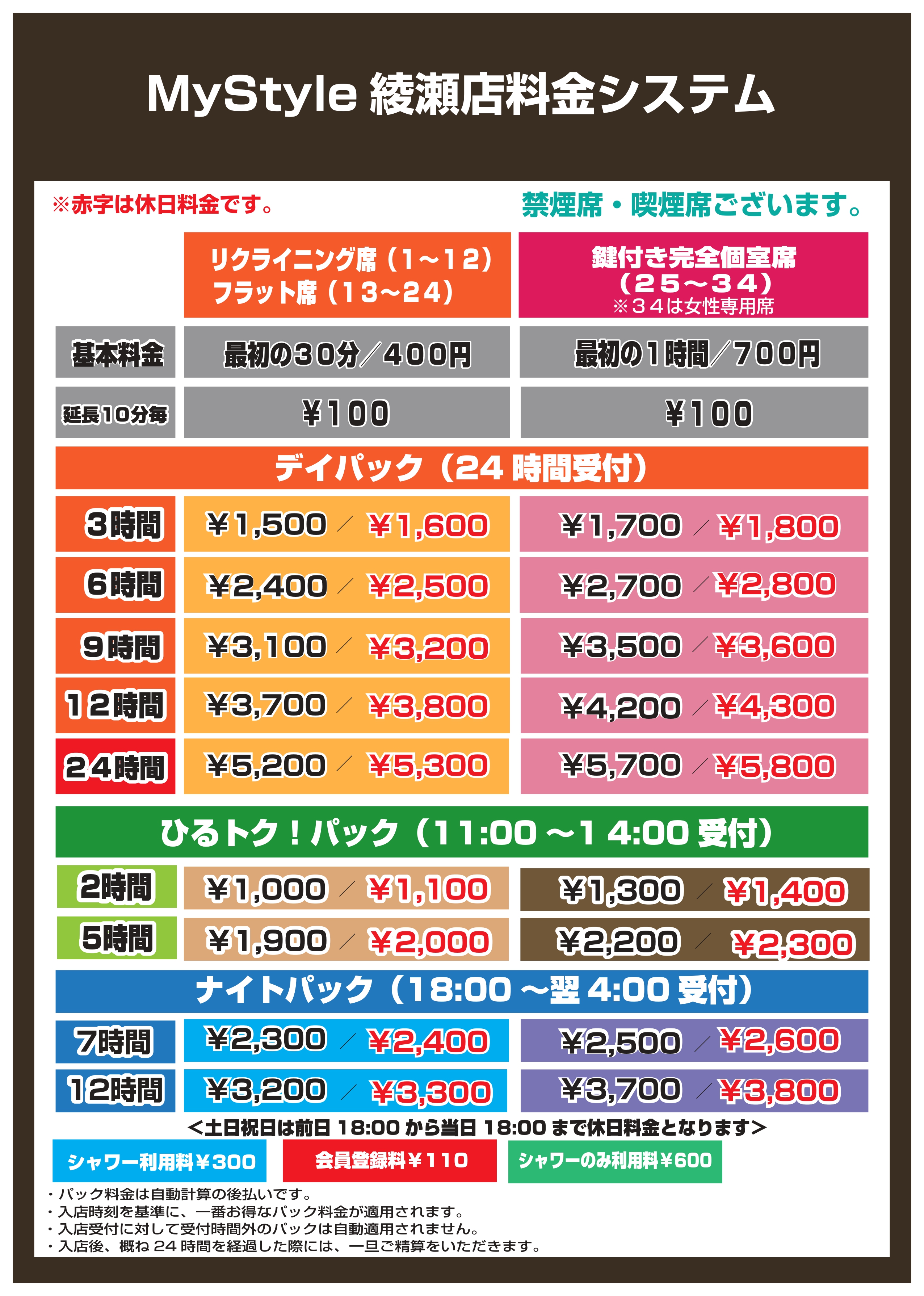 赤字は休日料金です。(土日祝日の前日18時から平日前日18時までの入店時)