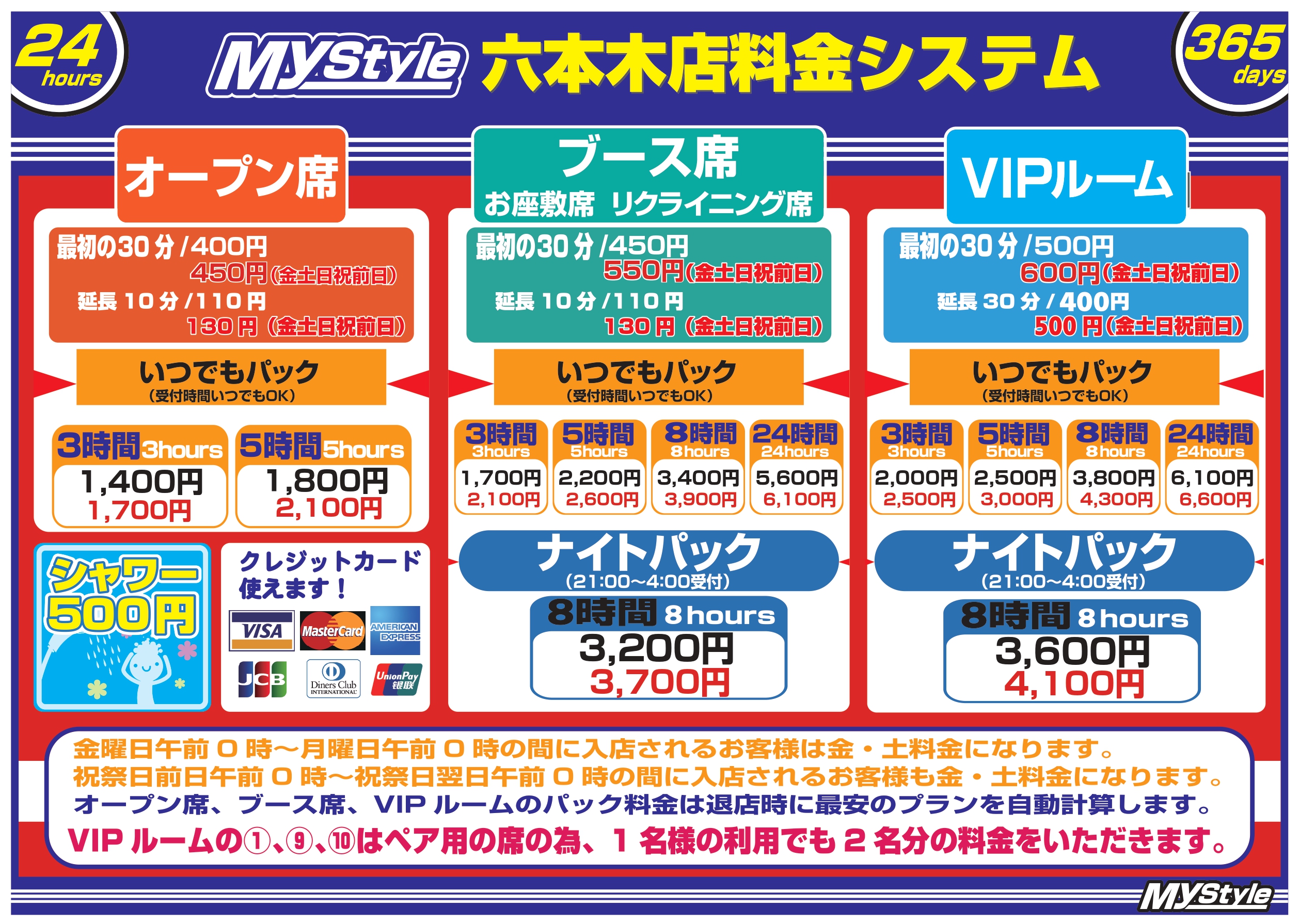 ※長時間利用のお客様、退店時に一番お得なパック料金を自動適用致します