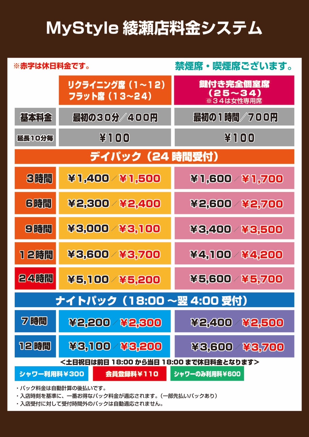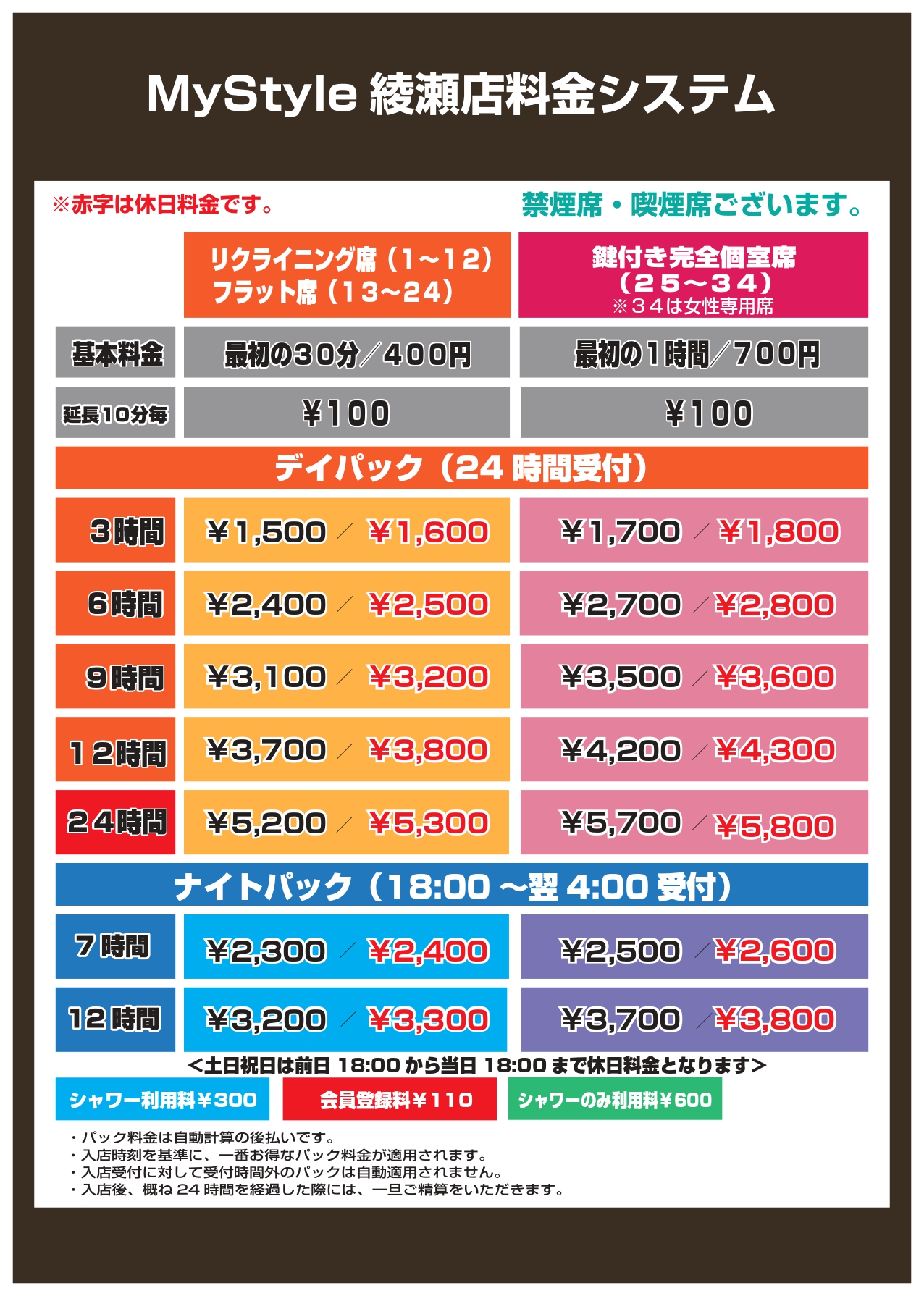赤字は休日料金です。(土日祝日の前日18時から平日前日18時までの入店時)