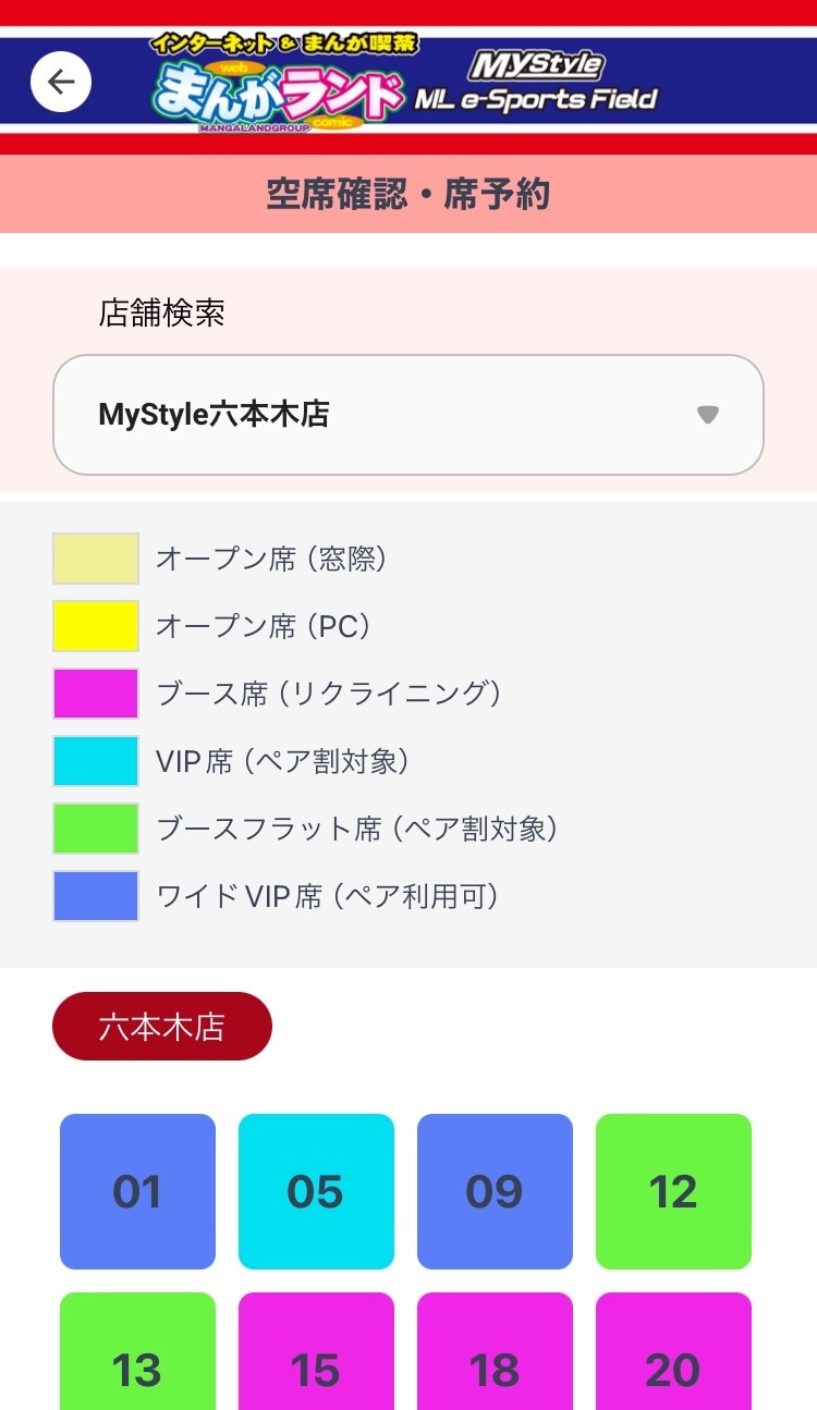⑥座席の名称一覧と、現在予約可能な席の番号が表示されます。