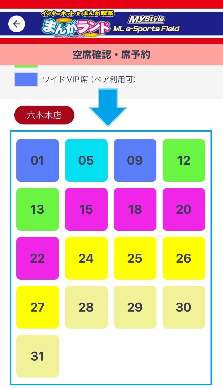 ⑦画面を下方向へスクロールして、予約したい席の番号を押します。
