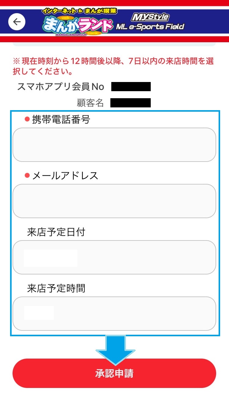 「携帯電話番号」「メールアドレス」「来店予定日」「来店予定時間」を入力してください。