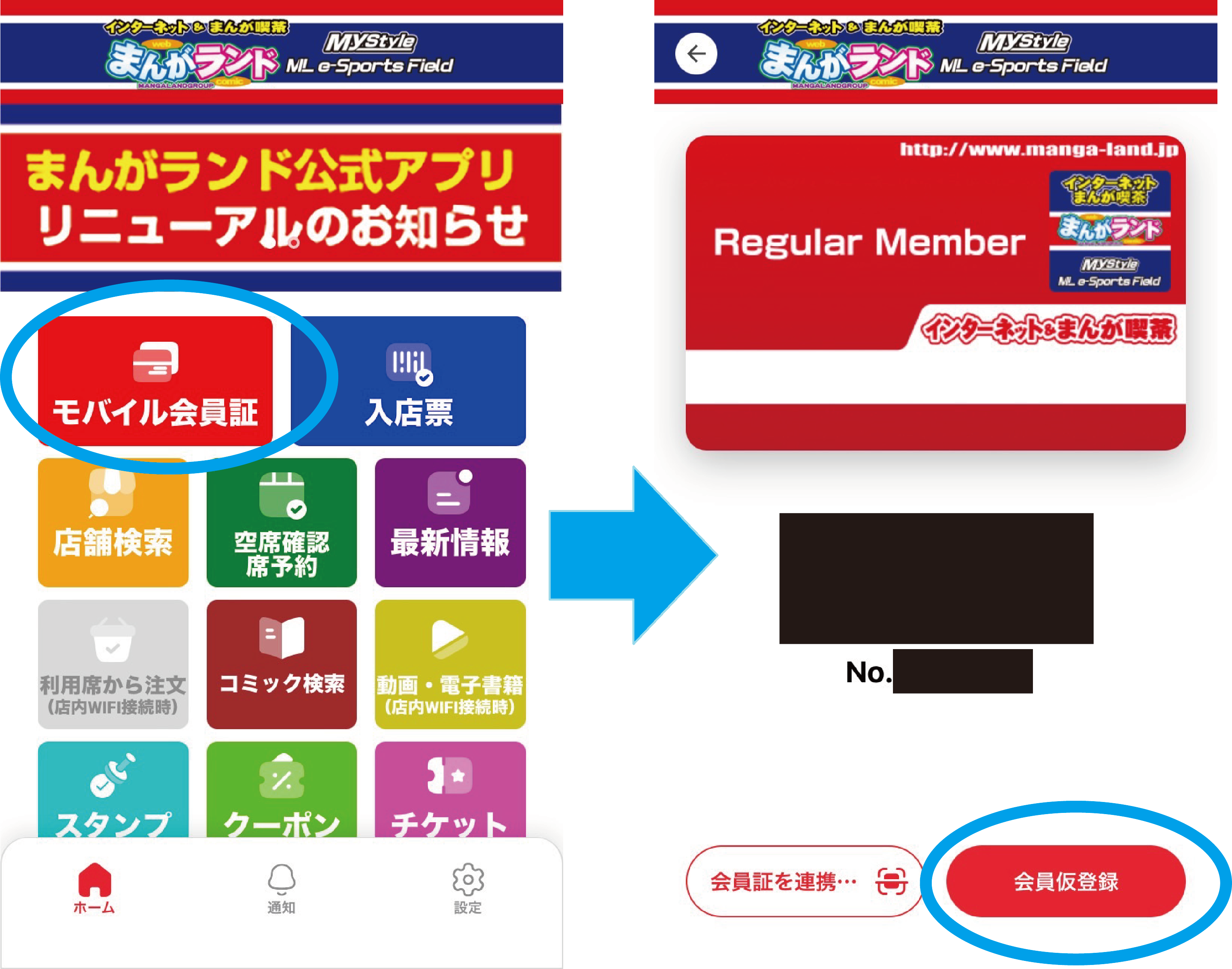 アプリメニュー画面の『モバイル会員カード』から、画面右下の「会員仮登録」を押してください。
