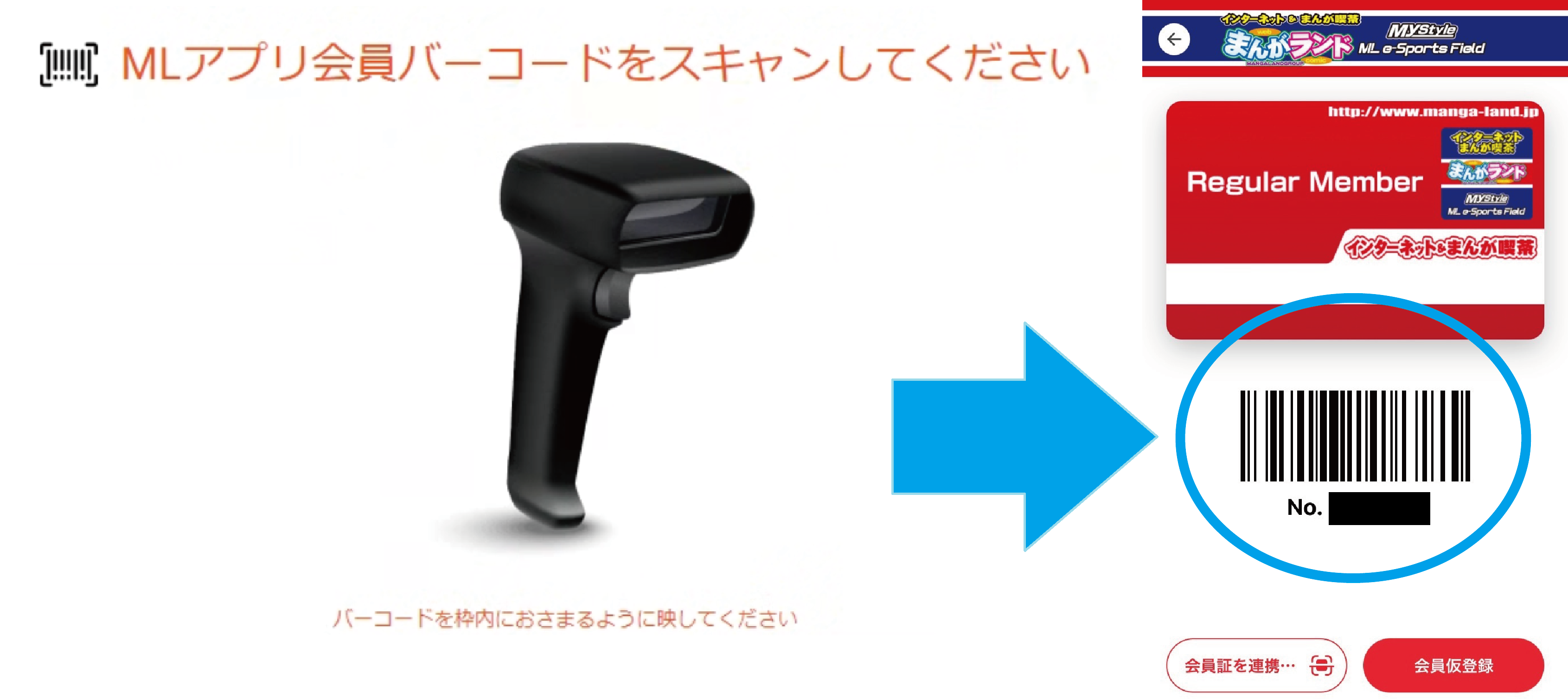 ご予約に使用した、MLアプリモバイル会員証のバーコード(7ケタの番号)をスキャナーで読み取ってください。