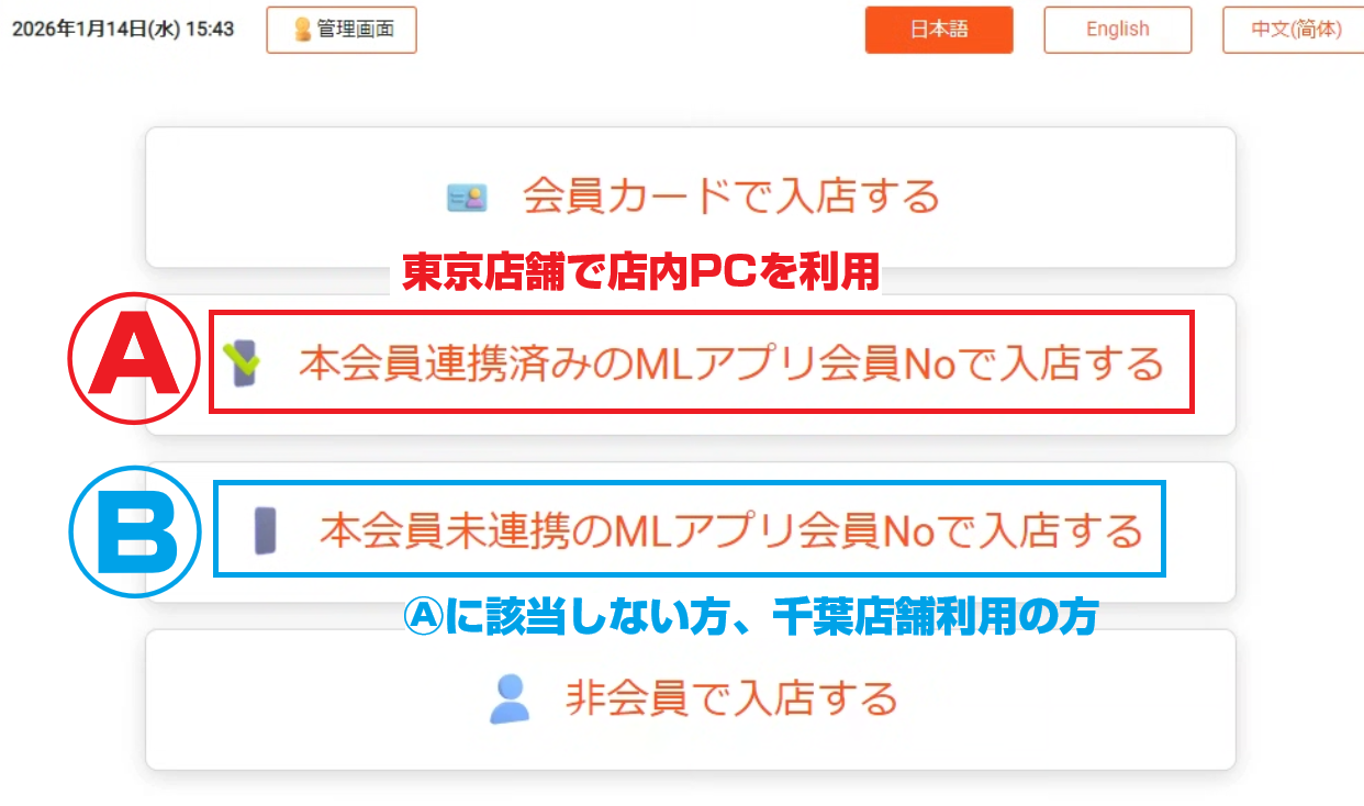 東京店舗で店内PCをご利用希望のお客様(本会員連携済み)は、Ⓐ「本会員連携済みのMLアプリNoで入店する」を選択してください。