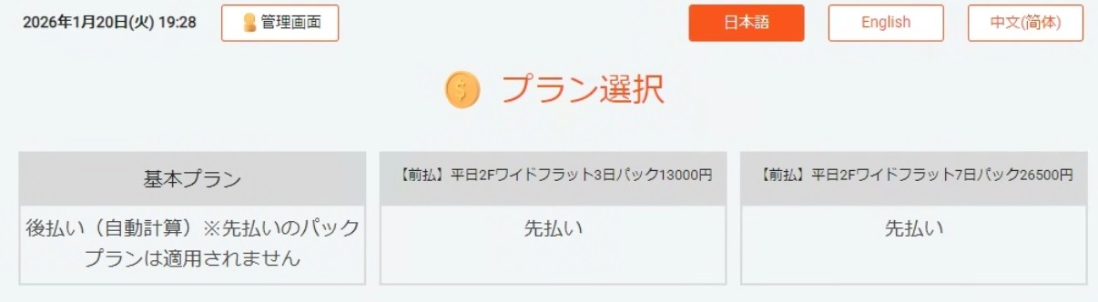 ⑰先払いのパック料金がある店舗では、プラン選択が表示されます。